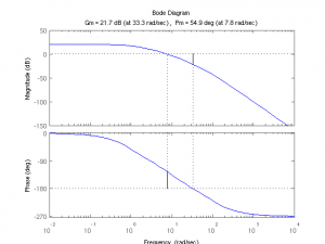 The Bode plot gives the gain (amplitude) and phase of the filter’s output compared to the input over the frequency domain. Of interest to feedback systems is the filter’s gain and phase margins and crossover frequencies. These can be determined by looking at the Bode plot, but naturally, Matlab has a function to plot them for us:
